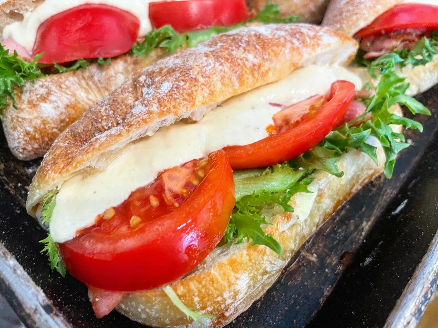 バゲットサンドは11時半頃より、パテ・ド・カンパーニュ、生ハムとカマンベールチーズのバゲットサンド、サバサンドと種類も豊富にご用意しております。