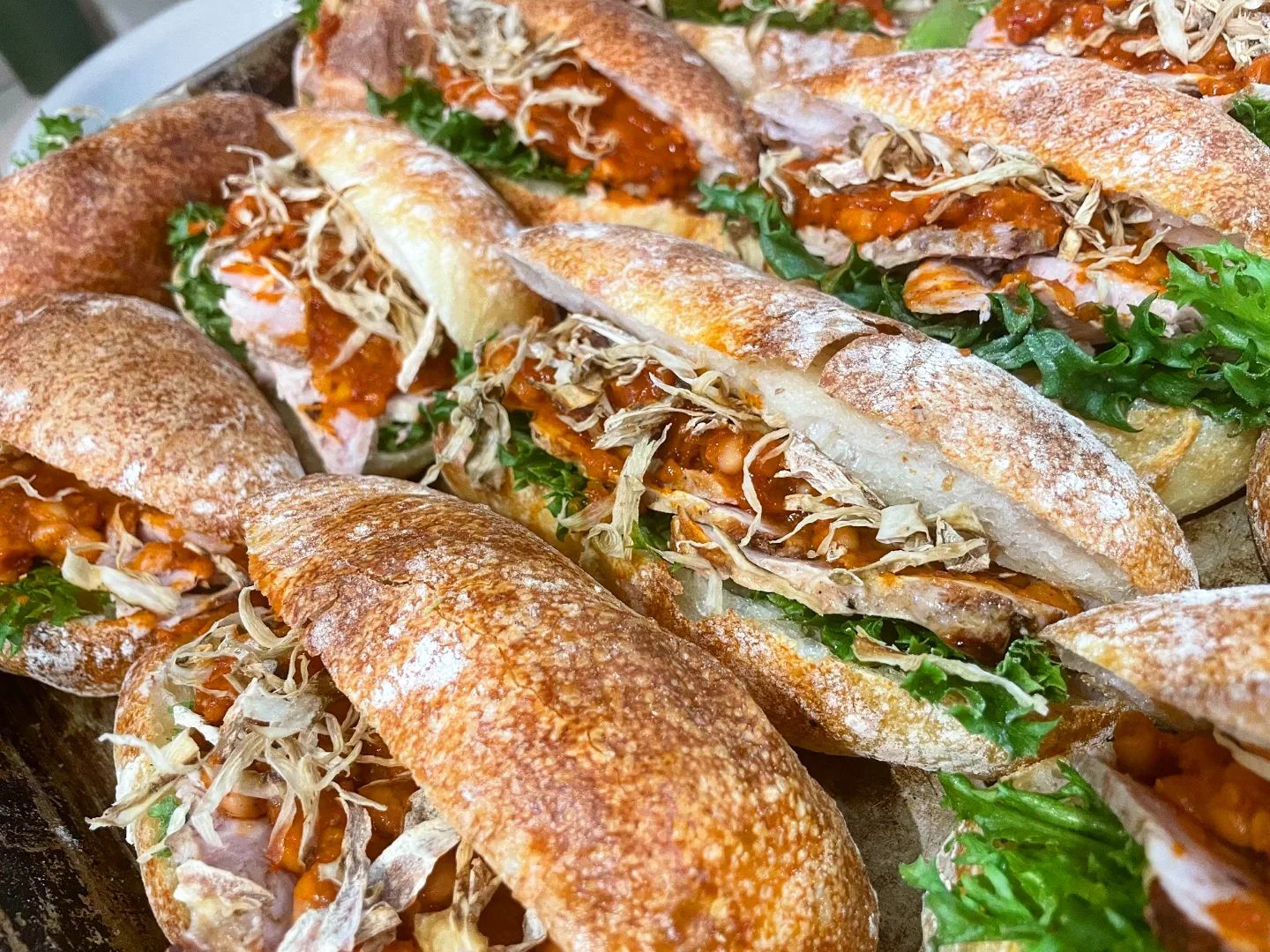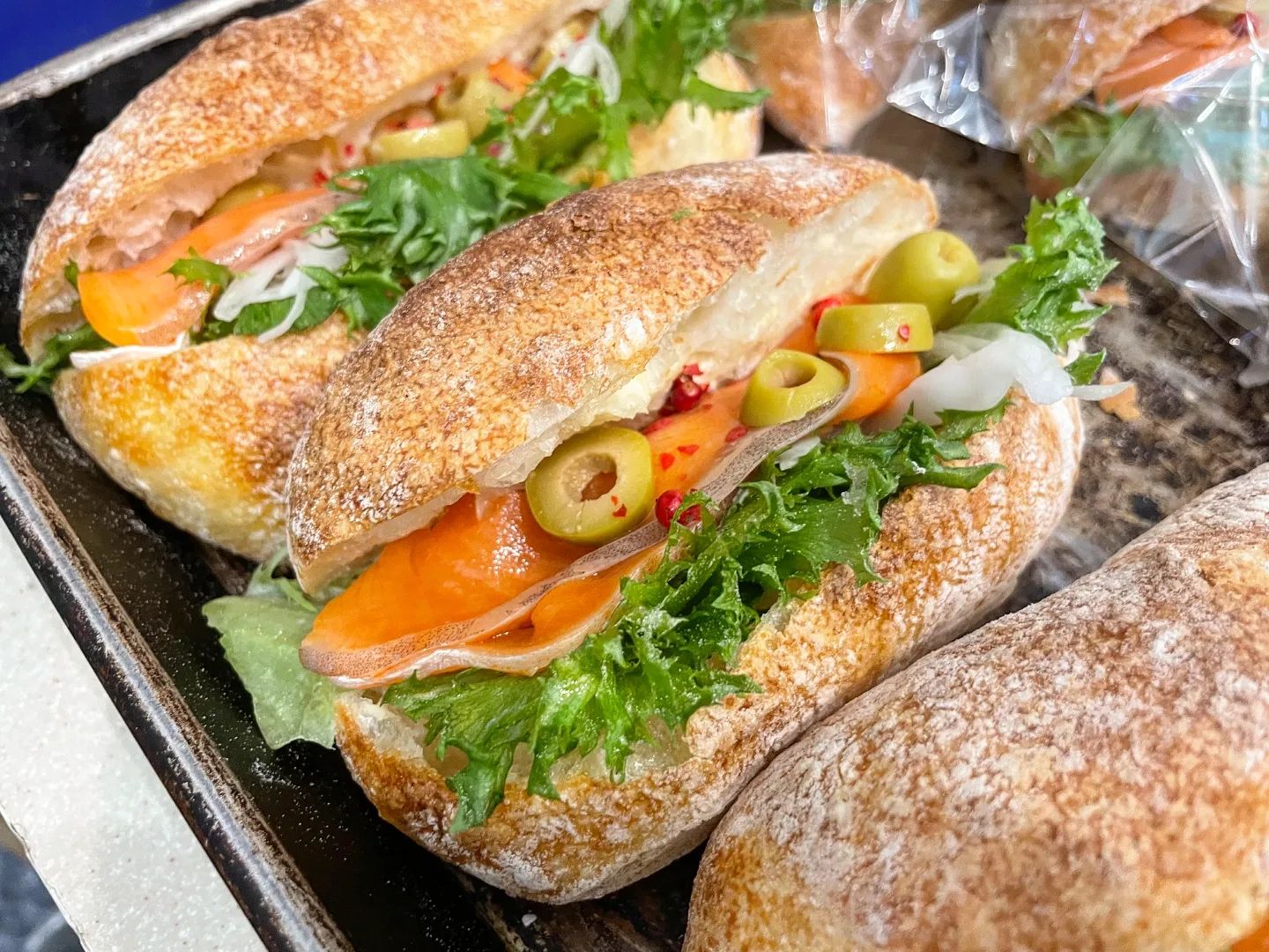本日は、「白インゲントマト煮ポークサンド」と「BLTサンド」「サーモンサンド」をたくさんご用意しております。